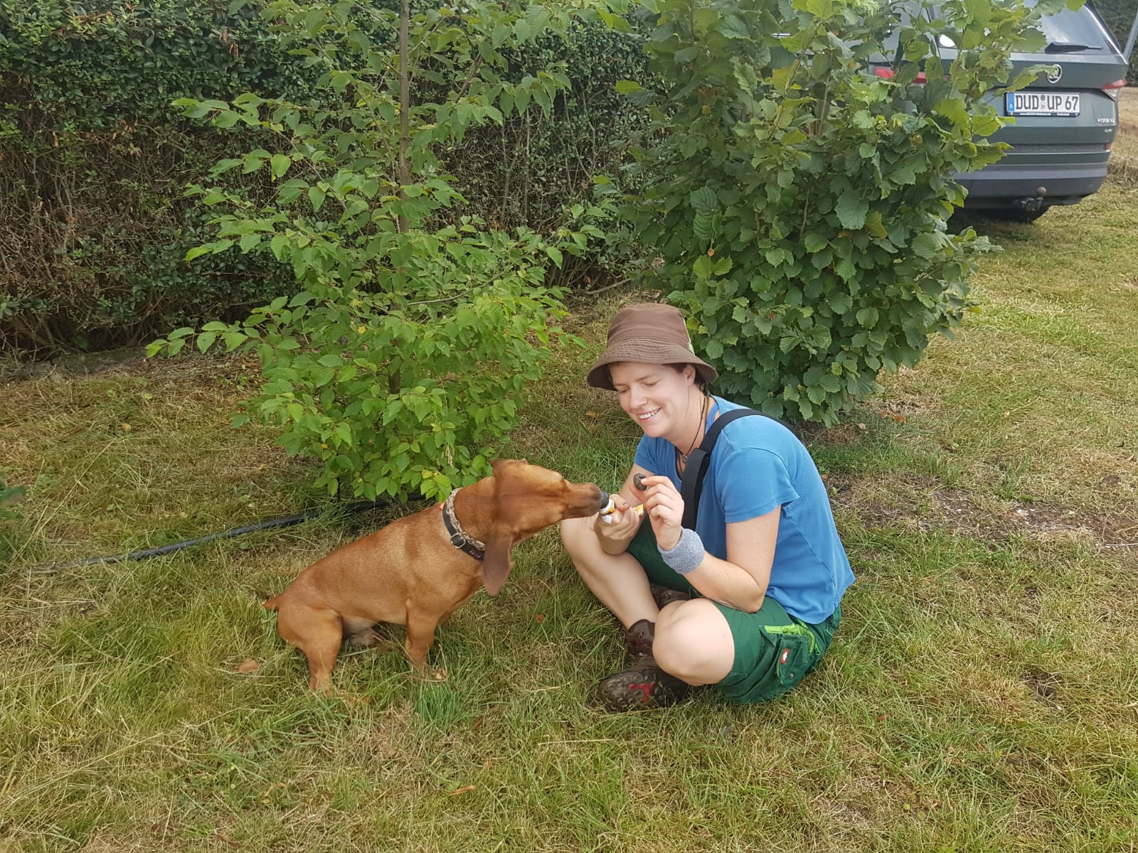 Trüffel in Thüringen schon 3 ½ Jahre nach Anlage der Trüffelkultur Eine mittlere Sensation ist das für deutsche Verhältnisse schon, denn normalerweise gilt, dass etwa sieben bis zehn Jahre nach Auspflanzung die ersten Trüffeln im Anbau zu finden sind. So die Meinung einiger Experten. Diese beiden wissen es besser: Andrea Männle und Uli Polle in Bleicherode. „Lurko hat einfach plötzlich mit der Trüffel gespielt, während wir auf der Plantage gearbeitet haben“ meldeten die begeisterten Trüffelanbauer ihren Fund der Trüffelschule. Die Sommer- bzw. Burgundertrüffel (Tuber aestivum) gehört bekanntlich zu den begehrten kulinarischen Köstlichkeiten. Beide Trüffelanbauer gehören zu einem Team von Hobbyforschern, die in Deutschland – insbesondere auch in Thüringen - wildwachsende Populationen untersucht haben. Die Ergebnisse dieser umfangreichen, ökologischen Studie flossen in ein neues Anbaukonzept der Forschungsgruppe Hypogäen ein. Die Fundstellen wildwachsender Trüffeln in Thüringen bleiben allerdings geheim. Im Dezember 2016 legten die beiden Duderstädter nach den Vorbildern der Natur ihren Trüffelgarten mit selbst gezogenen Trüffelbäumchen in Bleicherode an. Sie nahmen über Jahre an Weiterbildungsveranstaltungen der Deutschen Trüffelschule im In- und Ausland teil. Inzwischen haben beide eine Prüfung zum Trüffelanbauberater abgelegt und sich auf die aktive Produktionssteuerung durch Bewässerungsmaßnahmen spezialisiert. - Wer glaubt Trüffel bei seiner Arbeit im Garten oder anderswo gefunden zu haben, oder sich für den Trüffelanbau interessiert, kann sich zur Begutachtung an Herrn Polle über 0178-2668982 wenden. Als diese Nachricht bei Anja Kolbe-Nelde ( Thüringer Freilandpilze GmbH ) eintraf, ließ sie es sich nicht nehmen, sich mit ihren zwei selbst ausgebildeten Trüffelsuchhunden zu einer Nachsuche in Bleicherode zu verabreden. In kürzester Zeit hatten Jette und Alba die Fundstelle ausgemacht, aber keine weiteren Exemplare angezeigt. Was man wissen sollte: Trüffelfruchtkörper werden über einige Wochen verteilt zu mehreren Exemplaren vom Hyphensystem entwickelt. Der Reifegrad der zuvor gefundenen Trüffel ließ darauf schließen, dass hier erst Ende September bzw. Anfang Oktober die anderen Burgundertrüffeln die volle Reife erlangen. Daher wurde gleich ein Termin für eine Nachsuche vereinbart. Mit diesem sensationellen Fund ist deutschlandweit der erste frühe Nachweis von Tuber aestivum auf einer angelegten Trüffelkultur gelungen.